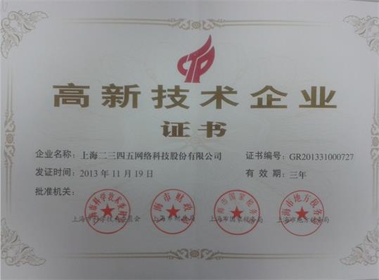 3月24日,上海二三四五網絡科技股份有限公司獲得上海市科學技術委員會、上海市財政局、上海市國家稅務局和上海市地方稅務局聯合頒發的高新技術企業證書,。公司被認定為高新技術企業,有效期為三年。根據相關規定,公司可以享受所得稅兩免三減半的優惠政策,即前兩年免收企業所得稅,第三年至第五年按照12.5%征收(正常為25%),第五年以后按照15%征收企業所得稅。這將有助于降低公司稅負,提高未來業績;同時,這為公司打造創新型企業帶來了新的機遇,使公司在下一步創新發展過程中有可能爭取到國家更多的技術和政策支持。