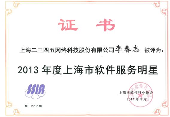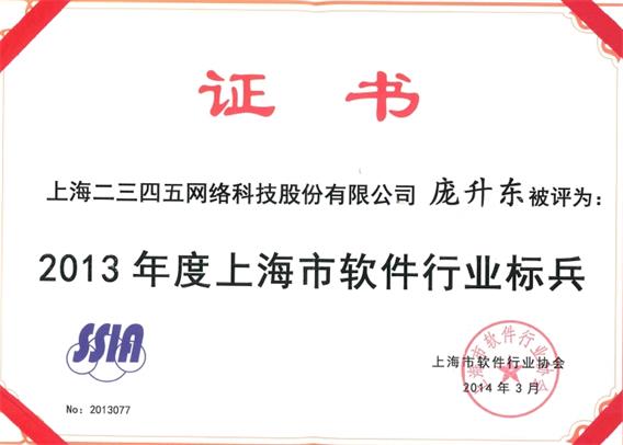 2014年3月26日下午,上海市軟件行業(yè)協(xié)會2014年工作年會暨“上海市軟件行業(yè)標兵&軟件行業(yè)服務(wù)明星”評選活動頒獎典禮在上海市經(jīng)濟管理干部學院禮堂舉行。上海市經(jīng)信委、科委、發(fā)改委、商務(wù)委等相關(guān)部門負責人,相關(guān)產(chǎn)業(yè)園區(qū)(基地)、行業(yè)協(xié)會、軟件企業(yè)負責人及十余家媒體記者,約300人到會。本次評選活動中二三四五董事長龐升東獲得軟件行業(yè)標兵稱號,二三四五軟件研發(fā)中心李春志獲得軟件服務(wù)明星稱號。