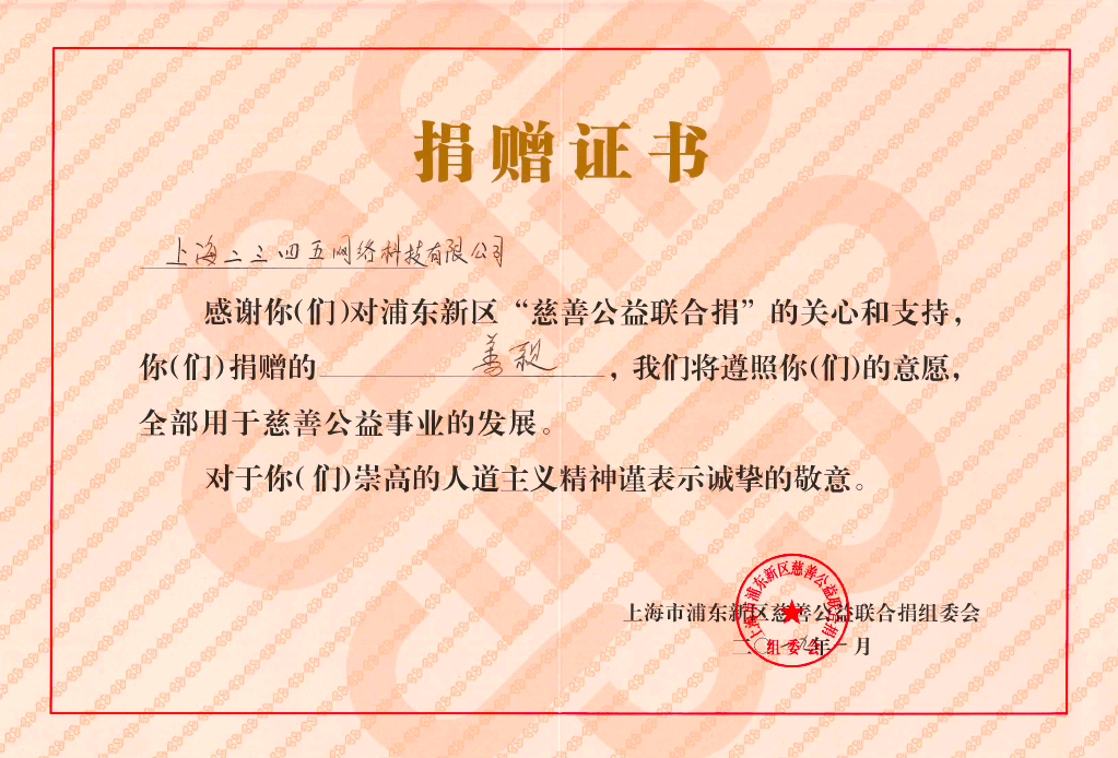 作為高橋鎮(zhèn)重點(diǎn)互聯(lián)網(wǎng)企業(yè),二三四五自13年開始連續(xù)多年參加高橋鎮(zhèn)“聯(lián)合公益捐“活動(dòng),為高橋鎮(zhèn)慈善事業(yè)做出突出貢獻(xiàn)。先后數(shù)次獲得上海市高橋鎮(zhèn)政府頒發(fā)的感動(dòng)高橋、高橋鎮(zhèn)經(jīng)濟(jì)建設(shè)突出貢獻(xiàn)獎(jiǎng)等榮譽(yù)。