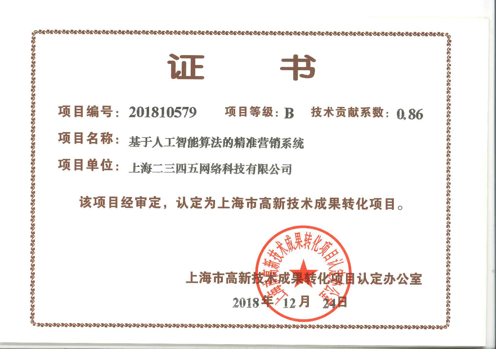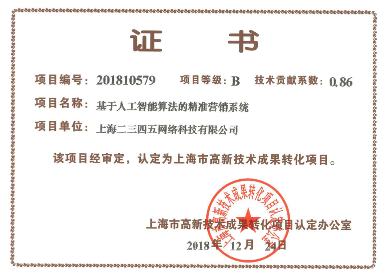 近日,上海互聯網巨頭、中國互聯網百強企業二三四五,再獲兩項上海市高新技術成果轉化認證,分別為上海二三四五網絡科技有限公司的“基于人工智能算法的精準營銷系統”和上海二三四五移動科技有限公司的“基于大數據的個性化移動應用分發系統”。本次公布的上海高新技術轉化成果認證的企業還包括中國石化在內的其他共計70個項目。